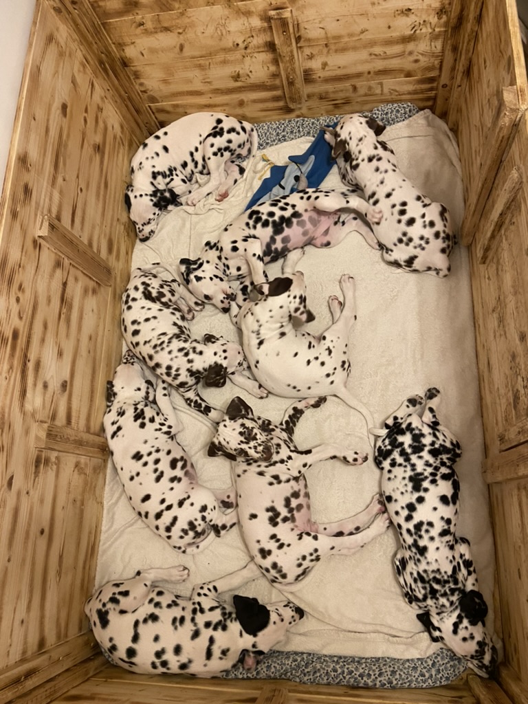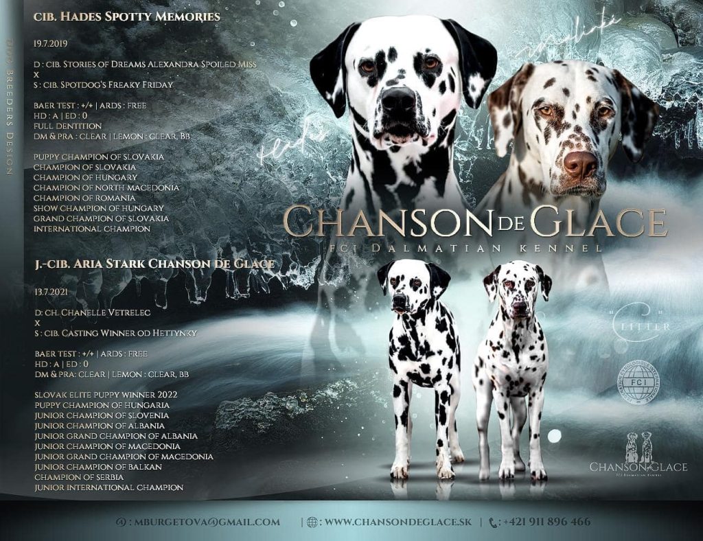 Chanson de Glace – vrh C Šteniatka 10.02.2024 Dňa 04.11.2023 sa v chovateľskej stanici Chanson de Glace narodilo 9 šteniatok – 6 sučiek a 3 psíci. Z toho 3 hnedobodkované sučky, 3 čiernobodkované sučky, 2 hnedobodkovaní psíci a 1 čiernobodkovaný psík.