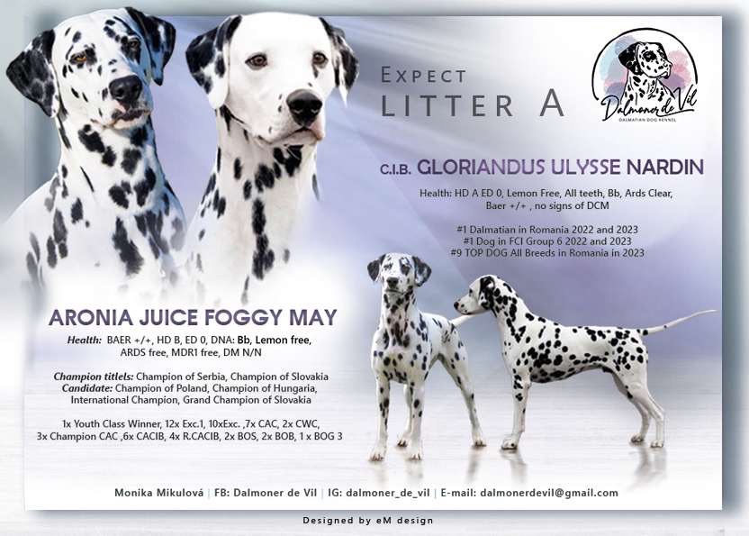 Dalmoner De Vil – vrh A Šteniatka 10.02.2024 V chovateľskej stanici Dalmoner de Vil sa dňa 10. 1. 2024 narodili dve šteniatka: hnedobodkovaná sučka čiernobodkovaný psík