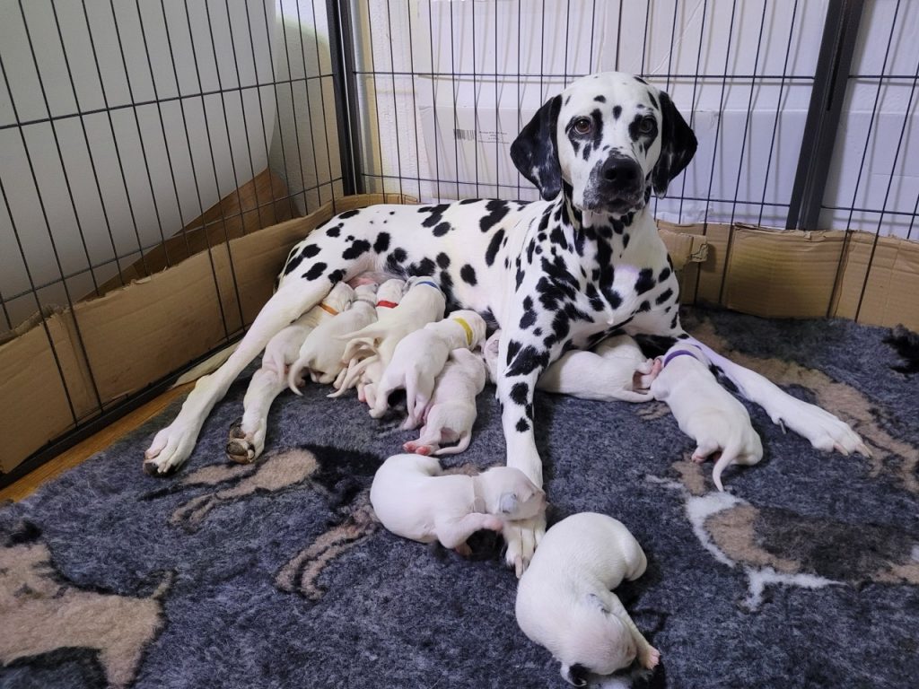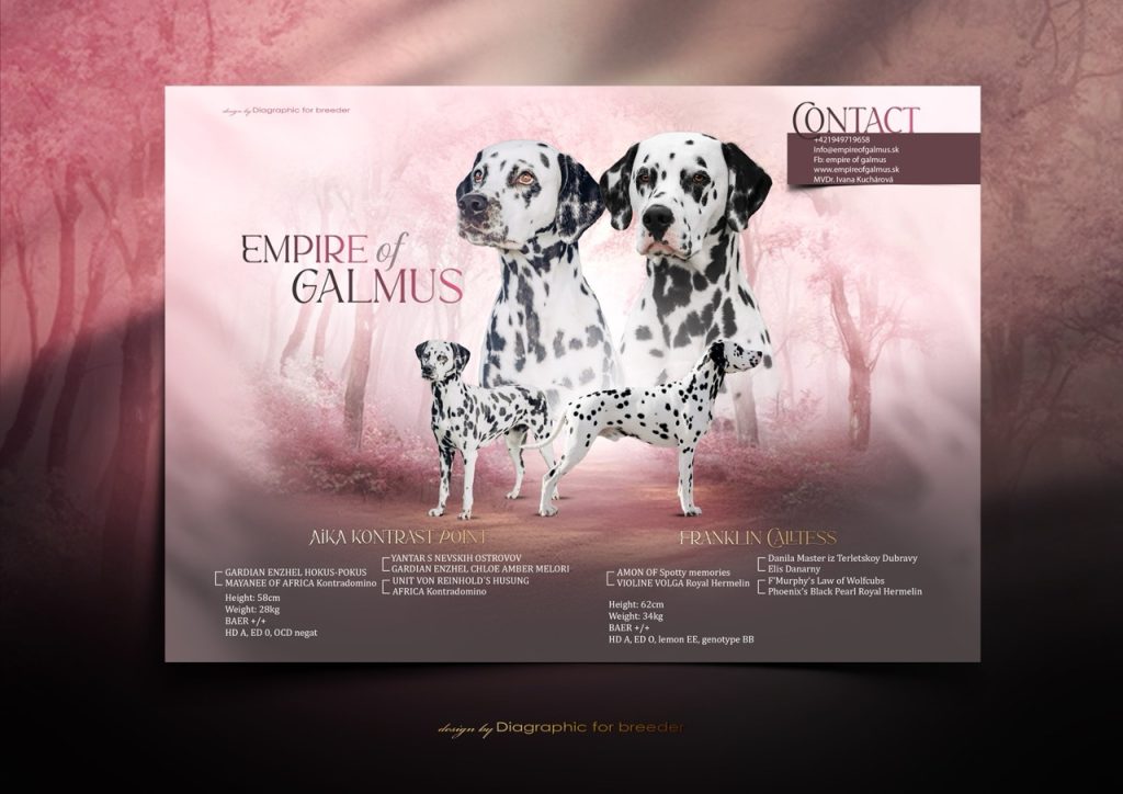 Empire of Galmus – vrh A Šteniatka 01.12.2025 25.11.2025 sa v chovateľskej stanici Empire of Galmus narodilo 12 čiernobodkovaných šteniatok – 9 psíkov (z toho dvaja majú platňu) a 3 sučky. Psíci sú ešte voľní, sučky sú už rezervované.