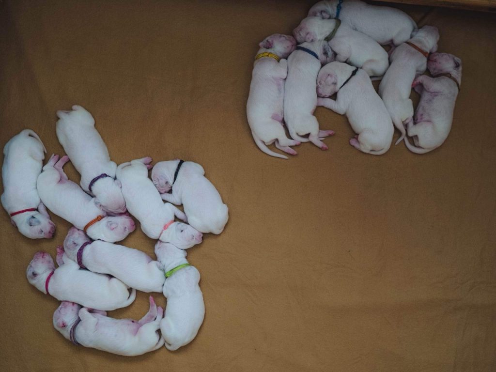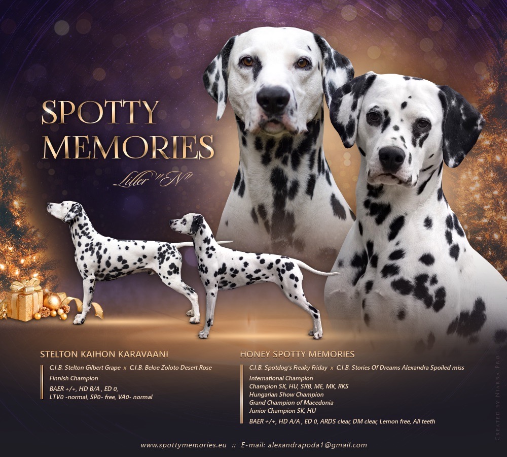 Spotty memories – vrh N Šteniatka 05.01.2023 Dňa 22.12.2022 sa v chovateľskej stanici Spotty Memories narodilo neuveriteľných 16 čiernobodkovaných šteniatok – 9 sučiek a 7 psíkov. *